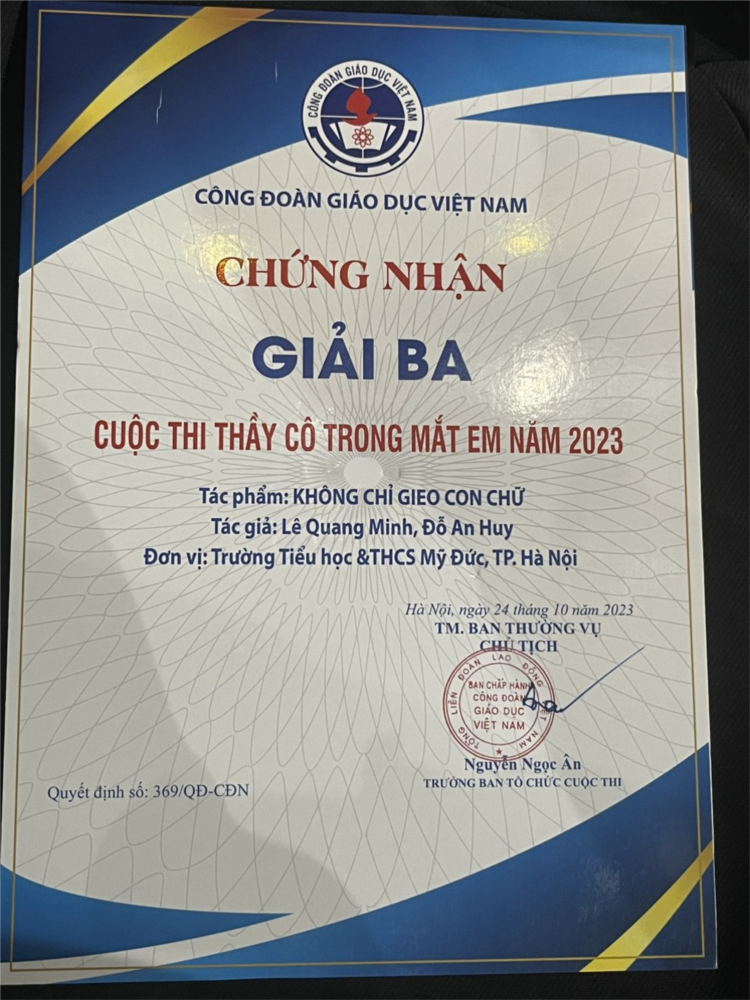 Tham gia cuộc thi năm nay, trường Tiểu học và THCS Mỹ Đức có tác phẩm "Không chỉ gieo con chữ" của 2 em học sinh là Lê Quang Minh 9A1 và Đỗ An Huy 9A1 viết về thầy giáo Hoàng Đức Mạnh - TTCM của nhà trường. Tác phẩm đã đạt giải Ba của cuộc thi "thầy cô trong mắt em" năm 2023.